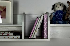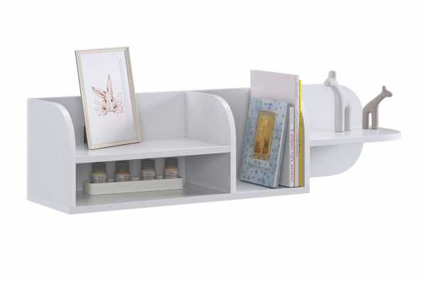 Полка состоит из прочного ЛДСП и имеет две открытые секции, которые удобно использовать для книг, игрушек, декора или учебных принадлежностей. Закруглённые боковые элементы придают конструкции мягкий, безопасный внешний вид, что особенно важно для детской комнаты.
