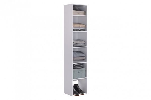 Шкаф оснащен накладными петлями с доводчиком от Боярд, которые обеспечивают плавное и бесшумное закрывание дверей. Наполнение в виде полок предоставляет удобный доступ к одежде, позволяя легко организовать внутреннее пространство.