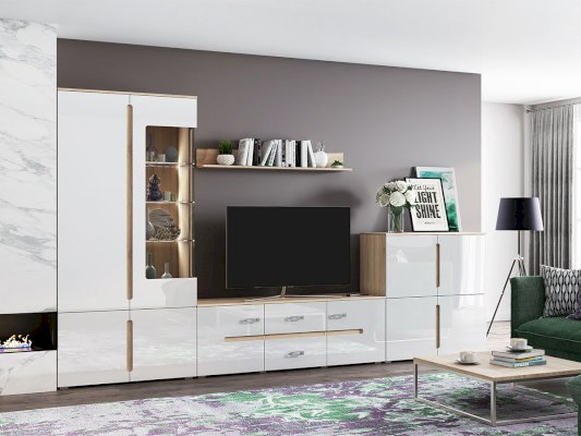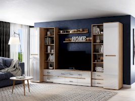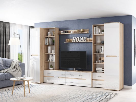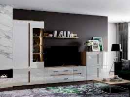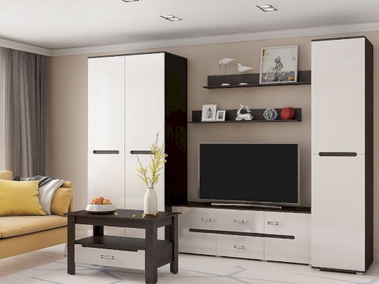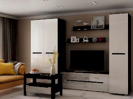 Внутреннее наполнение                  Модульная гостиная «Ким» выполнена в одном стиле и цветовой гамме со спальней «Ким», что позволяет подобрать мебель для квартиры любой площади. Отличается белыми глянцевыми фасадами. В нашем интернет-магазине вы можете собрать гостиную из модулей на свой вкус.